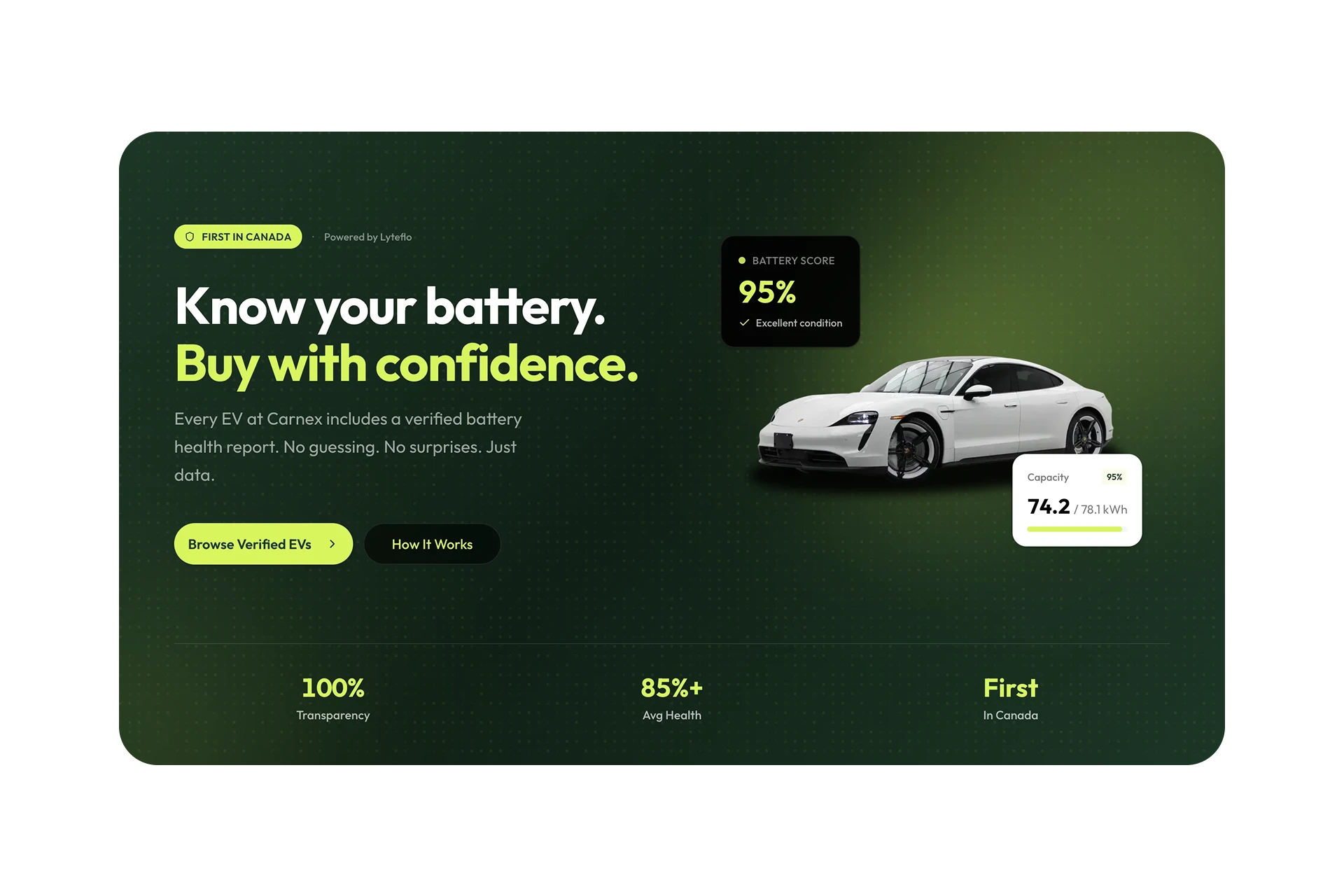Starting today, Carnex provides verified battery health reports on our EV inventory. Every listing with a battery score shows you: